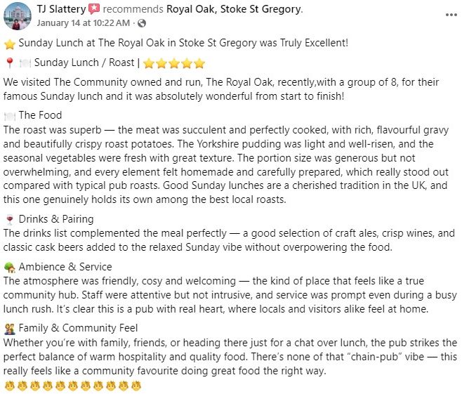 I don't know why there aren't many more reviews of this excellent pub, shop and cafe as this quite small village has done wonders in reviving this old pub by all working to raise money and staff it so successfully. Before Christmas they catered for 30 Senior Citizens from our own lunch club in North Curry and provided more than satisfying meals, tasty and more than generous. The pub is a real local with good range of ales. The cafe is open every day. They also do an excellent Wednesday lunch at an attractive price.